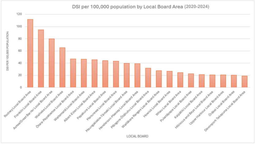 road network in these local board areas. Over the past twelve months (November 2024 – October 2025), within the Franklin local board boundary, 68% of DSIs are indicated in speed zones above 50kmh, and in the Rodney local